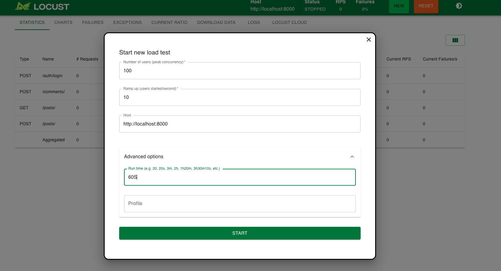Sanity Check를 위해 100명의 사용자로 60초동안 테스팅하도록 설정했다.