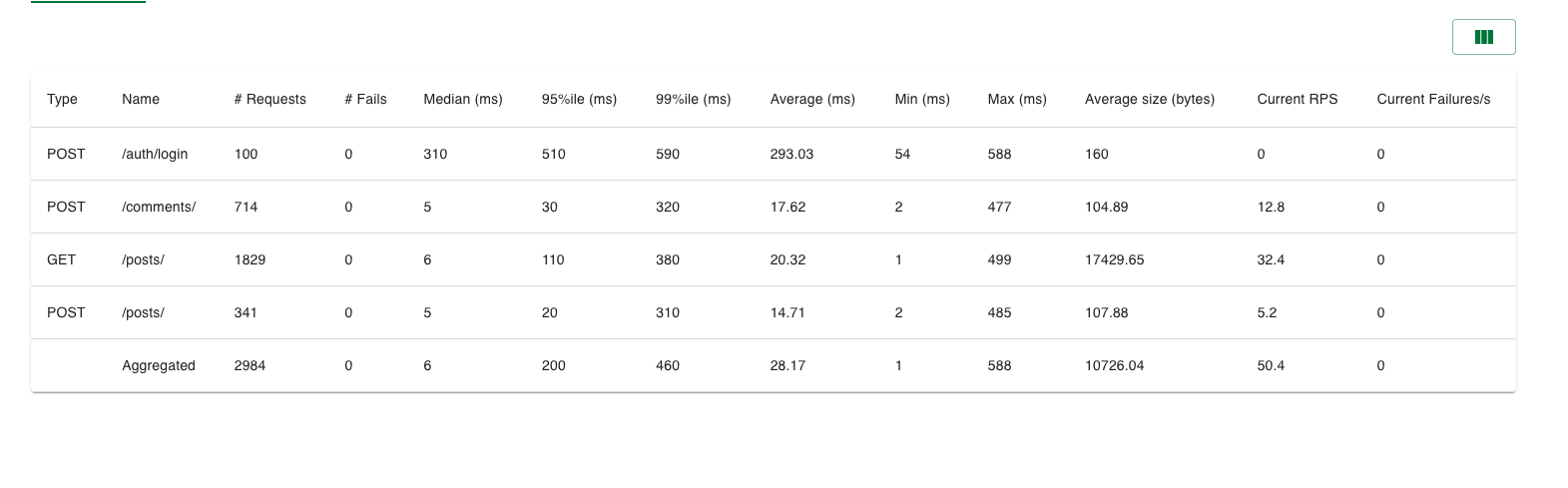 당장 빠르게 적용해볼 수 있는 개선법은 캐싱일 것이다. 로커스트를 살펴보면, GET posts가 가장 빈번하게 실패를 하고 있기 때문에 (11.1/s), 전체 목록을 캐싱하도록 다음 번에 적용해보겠다.