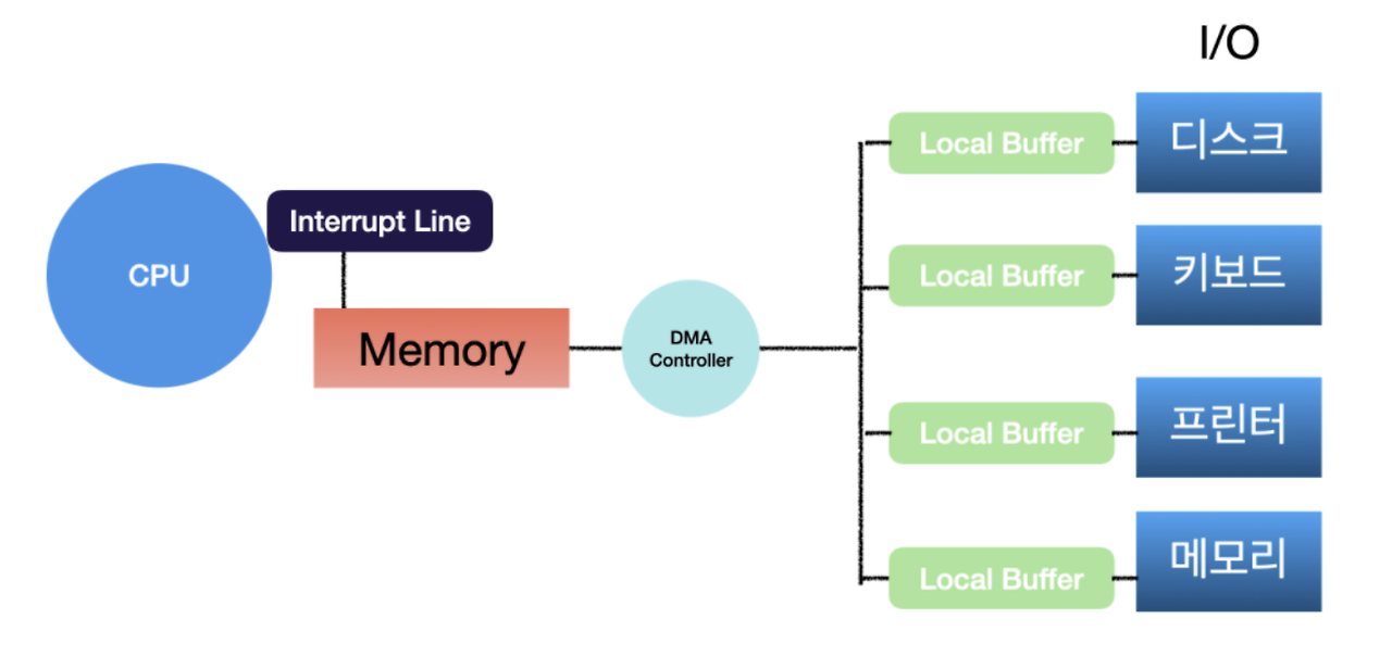 - 원하는 양의 입출력이 끝나면 DMA 컨트롤러는 인터럽트 컨트롤러에 신호를 보내어 인터럽트를 발생, CPU에 입출력 작업이 모두 끝났음을 알린다.