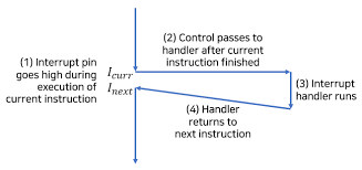 인터럽트의 처리 과정은 여러 단계를 거친다. 입출력 디바이스는 프로세서 칩의 핀에 시그널을 보냄으로 인터럽트를 발생시키고, 발생시킨 디바이스를 식별하는 예외번호는 시스템 버스에 보내지게 된다. 우선 현재의 작업에서 진행중인 인스트럭션의 실행을 완료한 후에, 인터럽트 핀이 high로 올라가있음이 확인되면 적절한 인터럽트 핸드러를 호출한다. 이 때 CPU는 현재 실행 중인 작업의 상태(프로그램 카운터, 레지스터 값 등)을 미리 저장해두어야 이후 원래 작업을 재개할 수 있다. CPU는 인터럽트 핸들러로 점프하여 해당 루틴을 실행한 후 기존에 진행하던 작업의 상태를 복원하여 재개한다.